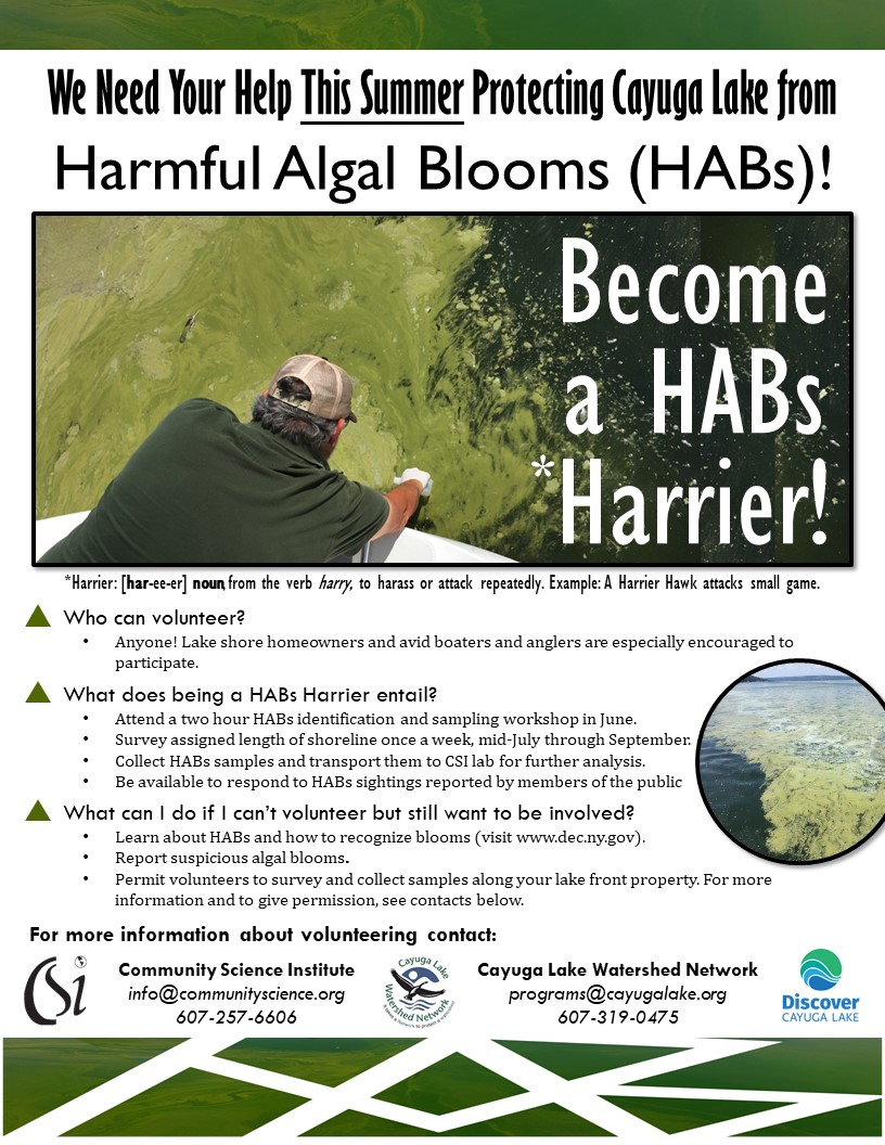 To learn more about the Cayuga Lake HABs Monitoring Program, please visit the Harmful Algal Bloom Monitoring page. If you would like to participate in the program and help monitor for HABs on Cayuga Lake this summer, please contact CSI at info@communityscience.org or call (607) 257-6606.