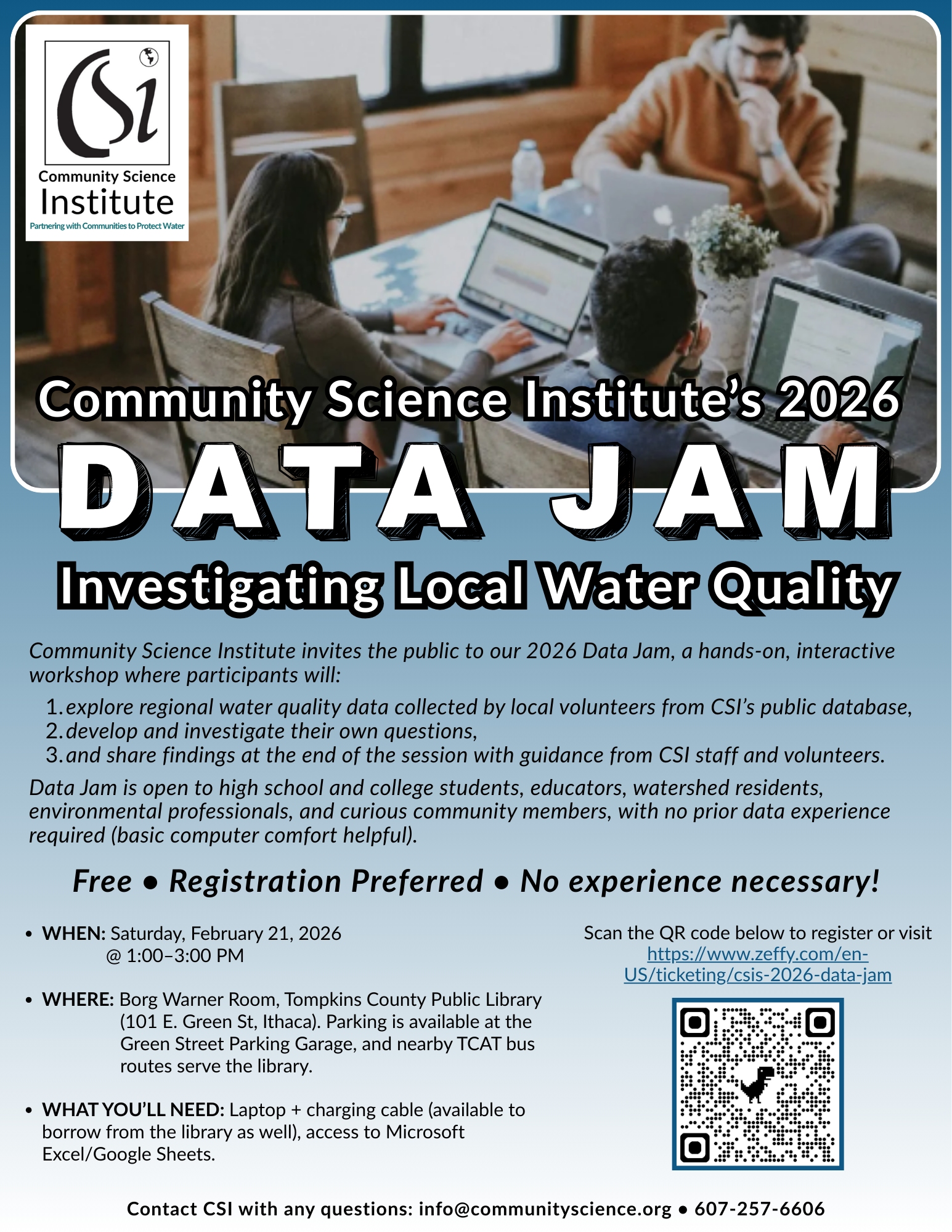 Join us for a collaborative, data-driven workshop where participants explore real water quality data collected by CSI volunteers on CSI’s public online database. Working in small teams, attendees will develop their own questions, investigate local water quality trends, and share findings at the end of the session. CSI staff will provide step-by-step guidance throughout.