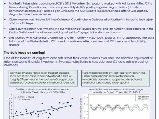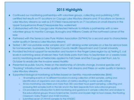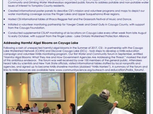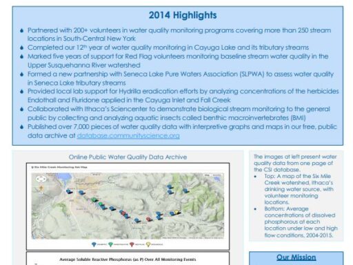 The Community Science Institute has partnered with volunteers to monitor regional water quality for twenty years. Each year, we publish an Annual Report showcasing our growth as an organization and the progress we’ve made as we work towards the sustainable management and protection of our shared water resources – now and in the future. We invite you to read these reports and we thank you for your support.