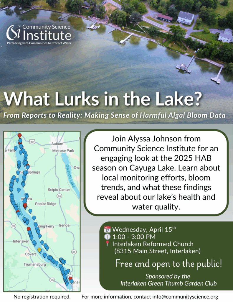 Join Alyssa Johnson from Community Science Institute for an engaging look at the 2025 HAB season on Cayuga Lake. Learn about local monitoring efforts, bloom trends, and what these findings reveal about our lake’s health and water quality.