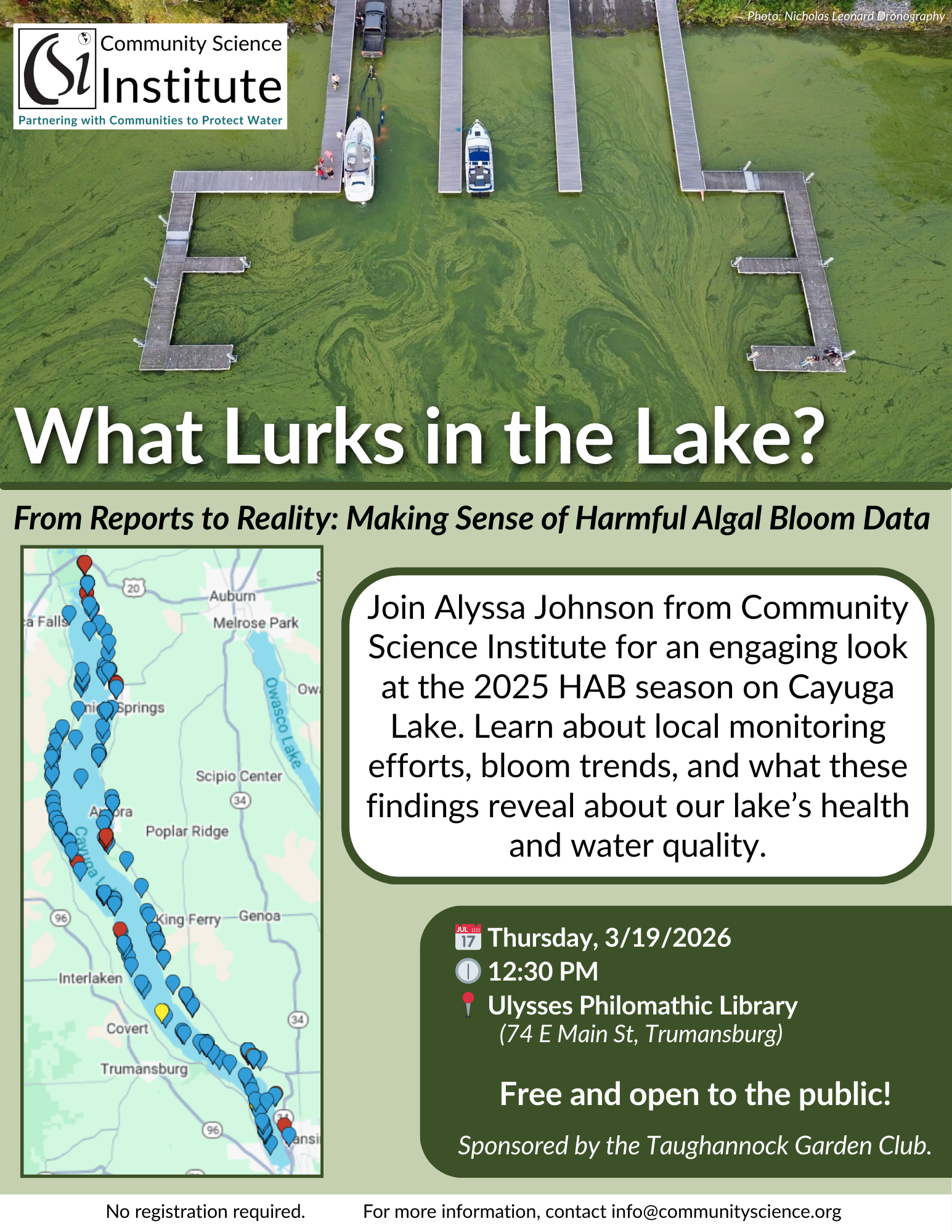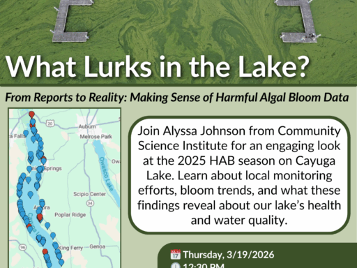 Join Alyssa Johnson from Community Science Institute for an engaging look at the 2025 HAB season on Cayuga Lake. Learn about local monitoring efforts, bloom trends, and what these findings reveal about our lake’s health and water quality.